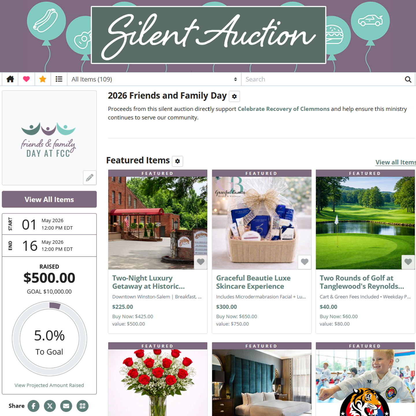 Open May 1–16. Every bid supports Celebrate Recovery of Clemmons.